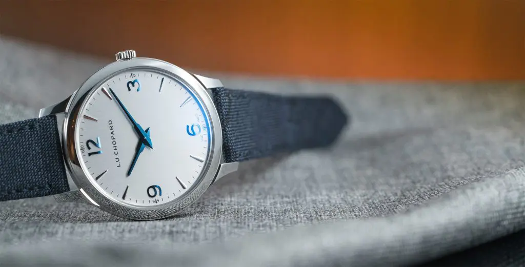 If the interior of the watch offers contemporary classical watchmaking, the exterior has a much more youthful demeanour. The 40mm steel case is far from the stuffiness you’d expect from a thin dress watch, offering a decidedly snappy sartorial edge. Most obviously there’s the unusual blue woven cashmere strap (with leather lining for durability), and the matching blued steel Arabic numerals and Dauphine fusée hands. It’s a very pared-back and assured dial design. There’s also a confidence in the finishing. The vertically brushed silver dial tones down the dressy and means this watch could easily be a daily wearer for more formal types. The case construction is quite sophisticated too, with satin-brushed case middle, polished bezel and top lugs, and gently curved inner lugs and caseback for comfort. While this very simple Chopard is aiming at a younger (or at least less conservative) customer, there’s no skimping on quality, and with a retail price just shy of $12K, the value is definitely there.