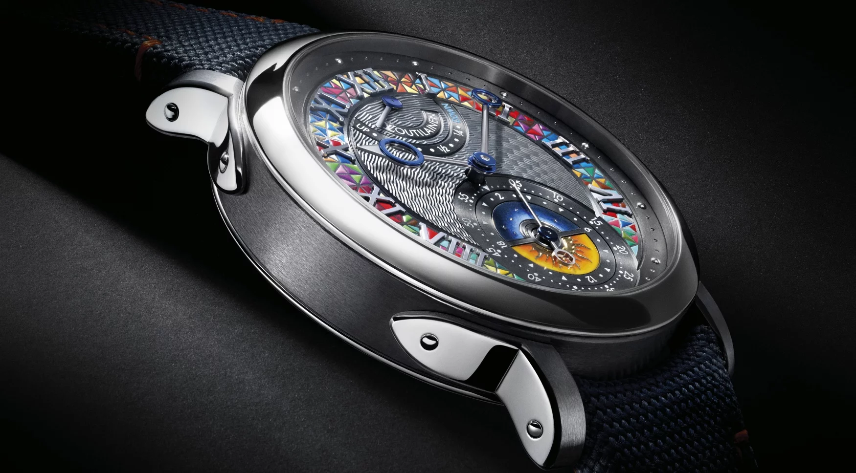 What’s far more interesting is its dial, which blends the talents of both brands. Crafted from gold, its centre portion is hand-guillochéd – a signature of Voutilainen’s – contrasted by a multi-coloured hour circle hand-painted by Maryna Bossy at La Fabrique des Arts, the Métiers d’Art workshop at La Fabrique du Temps Louis Vuitton. The day/night disc at the centre of the watch’s small seconds and dual time zone indicator, imagined in intricate enamel, was a product of the Voutilainen workshops. And then, at 12 o’clock, a plinth within the guilloché features a unique collaborative logo: “LVoutilainen”.