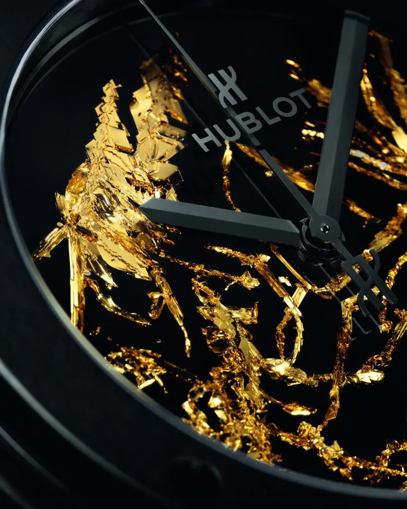 Nothing will prepare you for the deeply hypnotic dials of the 38 and 45mm versions of the Hublot Classic Fusion Gold Crystal. The stealthy matte black ceramic case is merely the stage upon which each watch has a unique dial decorated by 24K gold crystal. The process of re-creating the look of one of the rarest forms of gold in nature, is so complex that a mere 20% of crystals are kept. Cluster by cluster of frail branch-like crystal are fixed onto the dial surface by hand. Each composition is then sealed with a transparent lacquer in a vacuum, creating one-of-a-kind pieces of dial art. The result is more beguiling than the mere horology, time itself being a distraction from this intricate play of shapes in the delicate precious metal.