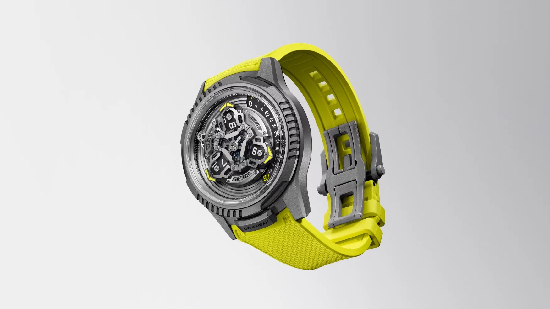 Whether it’s a Freak or an Urwerk, you should’ve expected the design to be out there and bold. At 44mm of sandblasted titanium full of facets, ridges, and indents, it most certainly is. In a rare turn of events, it’s a collaboration that successfully brings together two design ideologies that, despite perhaps having the same avant-garde goal, still take skill to combine. It goes further than just the physical shape of the case, too: the fluoro yellow used for the tips of the wandering hour hands and the strap is Urwerk’s frequently used Pantone 395 C, bringing a touch of familiarity.